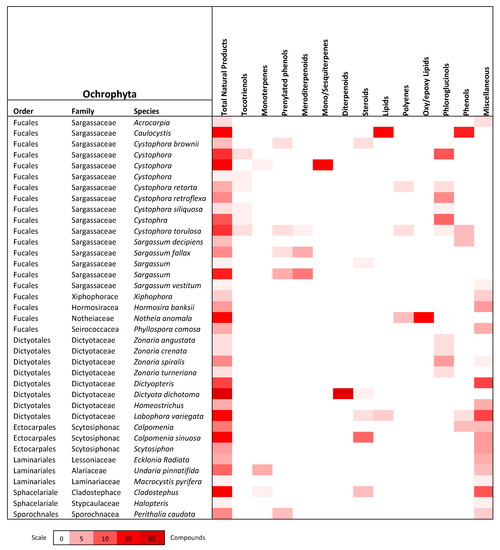 The Ocrophyta phylum has been the most studied phylum of algae in Port Phillip Bay to date and has yielded the largest number and variety of natural products. Caulocystis cephalornithos, Dictyota dichotoma and Notheia anomala represent the species of brown algae that have yielded the greatest number of secondary metabolites. Each of these species has shown the presence of an extensive range of phenolic compounds, diterpenoids, sesquiterpenoids and long-chain unsaturated lipids. Reported herein is a total of 281 secondary metabolites isolated from 37 species of brown algae within the period 1971 to early 2019, representing several terpenoid classes, steroids/sterols, lipids and other miscellaneous compound classes.