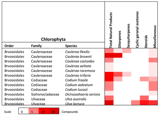 The phylum Chlorophyta are found to be distinctively green in color due to the presence of chlorophyll a and b occurring in high concentrations. Green algae proliferate within the euphotic zone of the ocean, or where there is sufficient sunlight to perform effective photosynthesis, usually growing within the intertidal zone up to depths of 50 meters. The most common and frequently studied species of green algae found in Port Phillip Bay are within the genera Caulerpa, Codium and Ulva. Many of the species that comprise the three mentioned genera can also be found in various tropical, sub-tropical and temperate marine climates around the world and are thus not exclusive to Port Phillip Bay. Common types of secondary metabolite classes found within the phylum Chlorophyta include diterpenes, sesquiterpenes, sterols and lipids. This review reports a total of 64 secondary metabolites distributed among 12 species of common green algae of Port Phillip Bay within the period 1971 to early 2019.