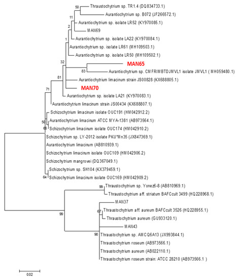 Isolated strains were identified phylogenetically using maximum parsimony and distance trees generated by using partial 18S rRNAs genes amplified with a set of primers for fungi/yeast described in [21] and were grouped into the genera Aurantiochytrium and designated as MAN65 and MAN70, GenBank accession numbers MH790117 and MH790119, respectively (Figure 1).