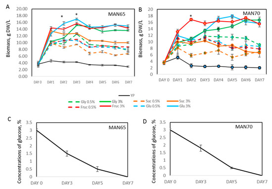Lipid production in MAN65 and MAN70 cells grown in YP media supplemented with three carbon sources is shown in Figure 3 and Figure S2. The addition of 3% glucose, fructose, or glycerol led to an increase in accumulation of lipids, reaching up to 40% DW (6.8 g/L, p < 0.05) by day 7.