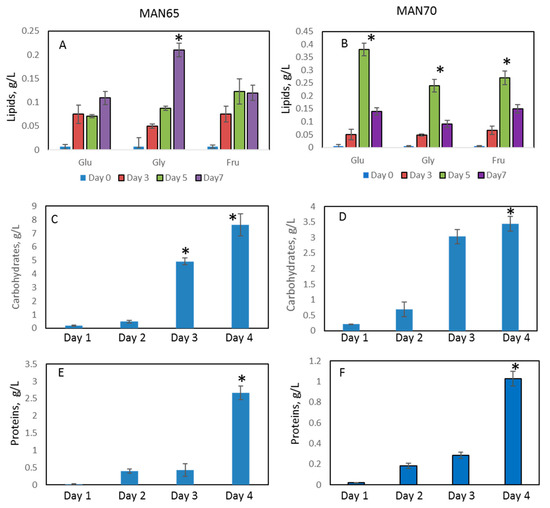 Accumulation of lipids, proteins, and carbohydrates in supernatants. (A,B): lipids; (C,D): carbohydrates; (E,F): proteins. (A,C,E): MAN65; B,D,F: MAN70. Glu: glucose; Gly: glycerol; Fru: fructose. * Significance levels: p < 0.05.