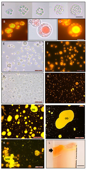 Recovery of oil bodies. (A–D): Oil bodies’ accumulation in cells; (E,F): cells before pH 12 treatment; (G–H): oil bodies 15 min after pH 12 treatment; (I–K: oil droplets and solidified oil droplets in the supernatant after 3–12 h of pH 12 treatment. (L): Accumulation of OBs (shown by arrow) after centrifugation; (A,C,E,G): bright-field microscopy; (B,D,F,H–K): fluorescent microscopy after staining lipids with Nile Red. OD: oil droplets; SOD: solidified oil droplets. Scale bars: (A–H, K) = 20 µm; (I,J) = 100 µm; (L) = 1 cm.