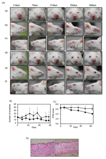 Psoriasis is a chronic immunological inflammatory disease of the skin characterized by dry silvery scales with eruptions. In this study, the severity of symptoms on the faces of m-Traf3ip2 mice was graded by phenotype using a scoring system based on clinical Psoriasis Area and Severity Index (PASI) and an ethological method as a scratch test. For this study, 1% fucoidan or 1% cellulose was administered by adding it to the AIN-93G diet, which is a normal diet. m-Traf3ip2 mice facial skin showed significant differences in symptoms between the fucoidan and normal diet groups. m-Traf3ip2 mice which were on the normal diet showed severe symptoms of psoriasis on their faces, whereas the mice on the fucoidan diet showed improved facial symptoms after 21 days and tended to enter remission in the following weeks (Figure 1A). The normal diet group exhibited increased scratching within a certain time frame, whereas the fucoidan diet group showed significantly decreased facial scratching from 1 week until after 56 days (Figure 1B). In the normal diet group, the mice with the highest PASI scores showed the most serious symptoms and the most severe scratch test results. On the other hand, the symptoms of the fucoidan diet mice group decreased from 21 days until after 63 days, and were significantly lower than in those of the control group (Figure 1C). Histological sections of the facial skin of mice that had high PASI scores showed thickening of both the epithelium and keratin layer of the epidermis by hematoxylin-eosin (HE) staining (Figure 1D).