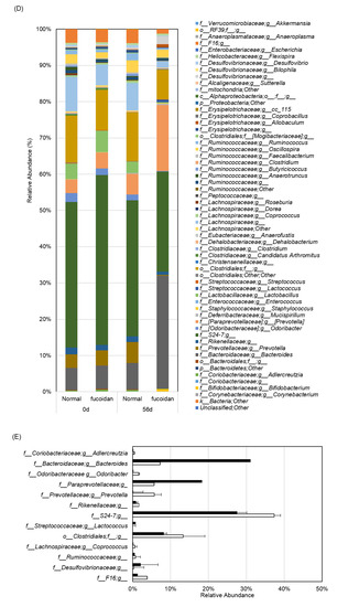 Microorganisms of the Desulfovibrionaceae family were found at slightly higher levels in the fecal microbiota of the fucoidan diet group compared to that of the normal diet group. The fecal microbiota of fucoidan diet group showed significantly lower populations of the genera Prevotella and Odoribacter, as well as of an unclassified S24-7 family in the Bacteroidetes phylum, than in the normal diet group after 56 days. In the Firmicutes phylum, the genera of Coprococcus, unclassified members of the Ruminococcaceae family, and unclassified members of the order Clostridiales were lower in fecal microbiota of the fucoidan diet group compared to those of the normal diet group. The normal diet group showed significant increase in the fecal microbiota of F16 family compared to those of the fucoidan diet group.