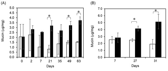 Mucin, which is produced by mucous/goblet cells, is a major component of mucosal fluid. Alterations in gastrointestinal mucin induced by dietary fiber may affect nutrient bioavailability, cytoprotection of the mucosa, or other aspects of gastrointestinal function [20,21]. In this study, mucin production in feces by mucous goblet cells was measured. Fluorescence labeling was used to measure terminal N-acetylgalactosamine in mucin components in feces. In m-Traf3ip2 mice, the fucoidan diet group showed increased mucin production, especially from 21 days after the diet had begun, whereas the normal diet group showed little change (Figure 3A). Similarly, wild-type, not mutated gene of Traf3ip2 BALB/c mice, fed a fucoidan diet showed significantly increasing mucin secretion compared to the group of a normal diet mice (Figure 3B). These results suggested that fucoidan promoted mucin production and created a better intestinal environment.