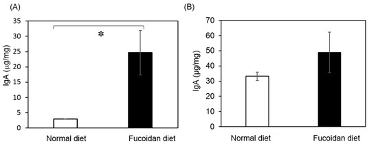 Quantification of total IgA in cecal contents of fucoidan diet group and normal diet group. Volume concentrations of (A) m-Traf3ip2 and (B) wild type mouse total IgA were quantified from 63 days and 31 days, respectively, in cecum contents by ELISA. White bar shows normal diet group and black bar shows fucoidan diet group from cecum. The absorbance of reaction products was determined at 450 nm, and the production was quantified. The calculated values for the in vitro experiments are expressed as mean ± SD (n = 5). Asterisk (*) shows significant difference (p < 0.05).