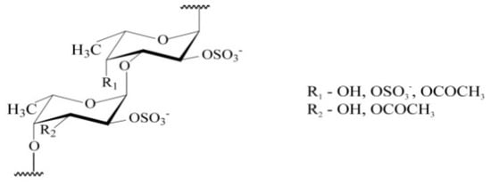 However, no fucoidan has been declared as a drug. The reason is that the structural diversity of fucoidans is extremely large. Fucoidans represent the family of fucose-containing homo- and heteropolysaccharides from polysaccharides with a high content of uronic acids and low fucose and sulfate contents, for example, from Hizikia fusiforme alga, for practically pure α-L-fucans with the main component of polysaccharide-fucose (F. evanescens). Except for fucose, these polysaccharides can contain minor amounts of other monosaccharides (galactose, mannose, xylose, glucose) and also sulfates, uronic acids, acetyl groups, and protein [2,3,4,5]. In particular, fucoidan from F. evanescens has a similar l-fucosyl backbone of alternating α (1→4) and α (1→3) l-fucosyls with sulphate substitution at C2. An additional sulphate may occupy position 4 in some of the α (1→3)-linked fucosyls, and the remaining hydroxyl groups may be randomly acetylated [3,4] (Figure 1).