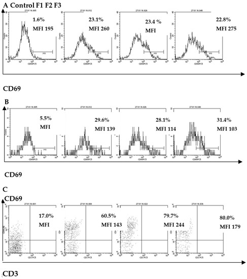 Also, the studied fucoidans (F1-3) enhanced the expression of activation markers on T-cells and on B-cells. The increase in the expression of CD69, CD25, HLA-DR, and CD71 molecules on T-cells facilitates the initiation of signaling events that regulate the entry of dormant cells into the cell cycle and has an effect on the formation of specialized T-lymphocytes for memory that effectively form the late phase humoral immune response.
