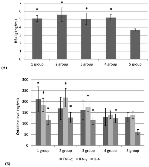 The level of serum IgG antibodies (A) and cytokines (TNF-α, IFN-γ, IL-4) (B) after mice BALB/c immunization with HBs-AG.