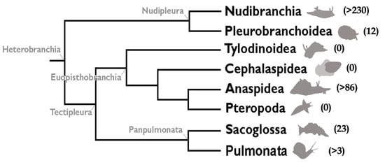- Wägele, H.; Klussmann-Kolb, A.; Verbeek, E.; Schrödl, M. Flashback and foreshadowing—A review of the taxon Opisthobranchia. Org. Div. Evol. 2014, 14, 133–149. [Google Scholar] [CrossRef]
