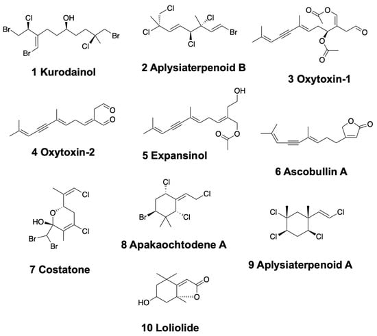- Quiñoá, E.; Castedo, L.; Riguera, R. The halogenated monoterpenes of Aplysia punctata. Comp. Study. Comp. Biochem. Physiol. B 1989, 92, 99–101. [Google Scholar] [CrossRef]