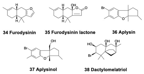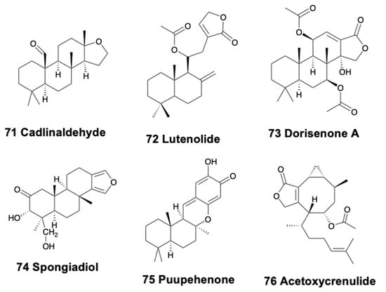 - De Silva, E.D.; Scheuer, P.J. Furanoditerpenoids from the dorid nudibranch Casella atromarginata. Heterocycles 1982, 17, 167–170. [Google Scholar]