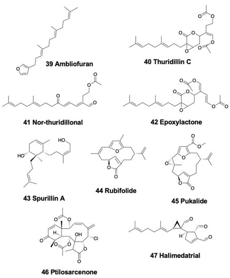 - Cambie, R.C.; Craw, P.A.; Stone, M.J.; Bergquist, P.R. Chemistry of sponges, IV. Spongian diterpenes from Hyatella intestinalis. J. Nat. Prod. 1988, 51, 293–297. [Google Scholar] [CrossRef]