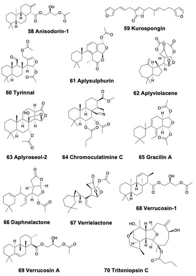 - McPhail, K.L.; Davies-Coleman, M.T. New spongiane diterpenes from the East African nudibranch Chromodoris hamiltoni. Tetrahedron 1997, 53, 4655–4660. [Google Scholar] [CrossRef]