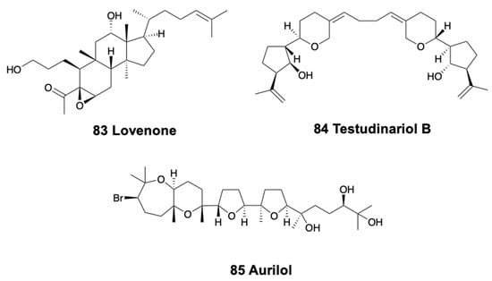 - Graziani, E.I.; Allen, T.M.; Andersen, R.J. Lovenone, a cytotoxic degraded triterpenoid isolated from skin extracts of the North Sea dorid nudibranch Adalaria loveni. Tetrahedron Lett. 1995, 36, 1763–1766. [Google Scholar] [CrossRef]