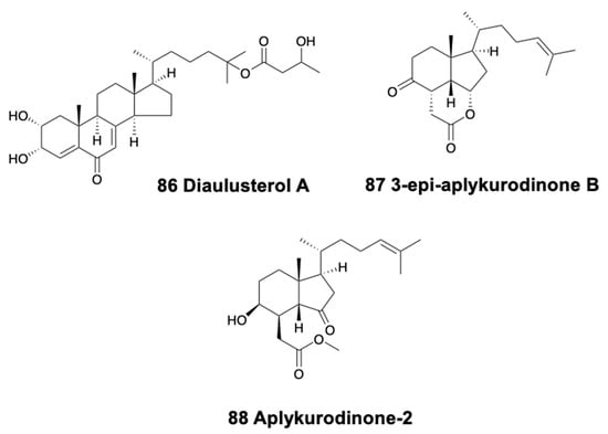 - Ortega, M.J.; Zubía, E.; Salvá, J. 3-epi-aplykurodinone B, a new degraded sterol from Aplysia fasciata. J. Nat. Prod. 1997, 60, 488–489. [Google Scholar] [CrossRef] [PubMed]
