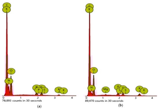 FTIR spectra of biological samples reported the macromolecular composition on the basis of the infrared absorption of functional groups [47]. The vibration intensity, reported as absorbance, is proportional to the relative abundance of organic molecules such as carbohydrates, lipids, and proteins [48]. The FTIR spectra analysis of GS provides interesting information about the changes in the macromolecule composition induced by different growth conditions, confirming the usefulness of FTIR as a fast, non-disruptive method to identify macromolecules in microalgae [49,50]. The intensity of the peaks corresponding to proteins, lipids, and carbohydrates was greater in HGS than in AGS and Sp, with the only exception with the peak observed around 1540 cm−1, which was higher in Sp and AGS, and was ascribable to N–H stretching of proteins. It is worth noting that Sp had a characteristic high content of proteins, as was also reported by Rafiqul et al. [51]. HGS was richer in polysaccharides and sugars when compared to AGS and Sp., as indicated by the high absorbance in the range 1174-950 cm−1. Polysaccharides in HGS are highlighted by the two peaks at 1148 and 1018 cm−1, which were similar to peaks that were present in Chlorella vulgaris by [52], but not present in AGS and Sp.
