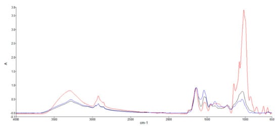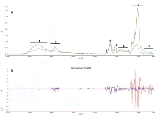 Each FTIR spectrum is formed by peaks arising from the infrared absorption of functional groups. The vibration intensity, reported as absorbance, is proportional to the relative abundance of organic molecules such as carbohydrates, lipids, and proteins. Table 3 reports FTIR peak assignments based on spectral values indicated in the current literature [26,27]. Although a certain degree of overlapping is present, macromolecules can be identified in relation to specific wavelength ranges [28]. Lipids can be identified in the range 3000–2800 and around 1740 cm−1, proteins in the range 3600–3000 and around 1640 and 1540 cm−1, and carbohydrates in the range 1174–950 cm−1.