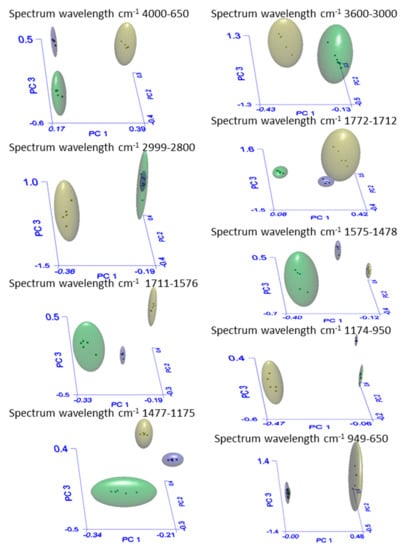 Figure 5 shows the 3D-PCA score plot generated by the SIMCA model. This multivariate analysis permits the visualization of the class separation among HGS, AGS, and Sp. The boundary ellipse (hyperboxes) defining each cluster represents a 95% confidence interval, and the points within each cluster represent the spectrum wavelengths of each sample in the three-dimensional space. Data analysis performed in smaller ranges of the spectrum (Table 5) revealed that there were significant differences among groups. The interclass distance clearly underlines the changes in GS as a consequence of the modification of the metabolism due to the growth conditions. In fact, although Sp and AGS are different microalgae species, both grown as autotrophs, they appeared to be extremely similar with an interclass distance ranging from a minimum of 4.94 (spectrum range 2999–2800 cm−1) to a maximum of 21.7 (spectrum range 1575–1478 cm−1), whereas HGS and AGS were found to be extremely different with a minimum inter-distance of 15.4 and a maximum of 78.3 (respectively for the intervals of 1711–1576 and 1174–950 cm−1) due to the diverse metabolism impost by the heterotrophic and autotrophic conditions.