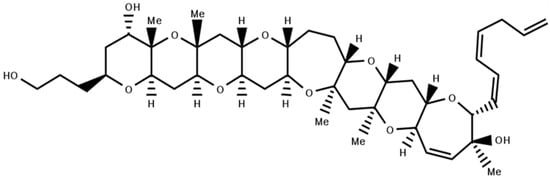 - Cuypers, E.; Abdel-Mottaleb, Y.; Kopljar, I.; Rainier, J.D.; Raes, A.L.; Snyders, D.J.; Tytgat, J. Gambierol, a toxin produced by the dinoflagellate Gambierdiscus toxicus, is a potent blocker of voltage-gated potassium channels. Toxicon 2008, 51, 974–983. [Google Scholar] [CrossRef] [PubMed]