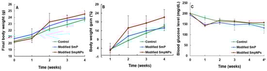 Growth performance and blood glucose level of mice during 4 weeks of modified SmP and SmPNPs treatment. (A) Body weight (g); (B) Body weight gain percentage (%); (C) Blood glucose levels (mg/dL). 4* denoted the fasting glucose level at the end of the experiment (4th week); (means ± standard deviation, n = 4 per replicate, 3 replicates per group).