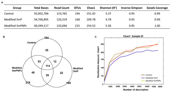 To evaluate the effects of modified SmP and SmPNPs supplementations on the gut microbial community, we analyzed the fecal microbial composition by 16S rRNA metagenomics sequencing. The highest read count (133,046) and number of Operational Taxonomic Units (OTUs) (215) were reported in the modified SmPNPs group. The modified SmP group showed a lower read count (120,319) and OTUs (168) than the control group. The alpha diversity of gut microbiota was higher in modified SmPNPs and control groups than the group fed with modified SmP. Although the diversity values were not significantly higher or lower, both the Shannon–Weiner and Simpson’s diversity indices were similarly higher in the modified SmPNPs (5.36 and 0.95, respectively) and the control (5.37 and 0.95, respectively) groups regardless of OTU count, than the modified SmP group (4.78 and 0.93, respectively). The highest Chao1 index and Good’s coverage indices were also reported in the modified SmPNPs group (Figure 2A). As illustrated in the Venn diagram, 114 OTUs were identified as core OTUs, which were common to all three groups. The modified SmPNPs group showed the highest unique OTUs (48) as compared with the modified SmP (22) and the control (35) groups (Figure 2B). Rarefaction curves that displaying species richness also have become more plateaued to the right in the SmPNPs treated mice (Figure 2C), further confirming the high richness in the microbial community. This indicates the saturation of sequencing reads of the samples, and we decided further sequencing would not be necessary for searching more OTUs.