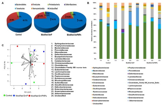 Diet-specific changes of taxonomic composition of fecal microbial community of control, modified SmP, and modified SmPNPs treated mice. (A) Comparison of relative abundance of metagenomics based gut microbial phyla; (B) Comparison of relative abundance of metagenomics based gut microbial families; (C) Principal component analysis (PCA) of relative abundance of gut microbiota families. The percentage variance of PC1 and PC2 are represented in x and y axis, respectively, (Software version: R 3.6.1, packages. Vegan). (n = 4 per replicate, 3 replicates per each group).