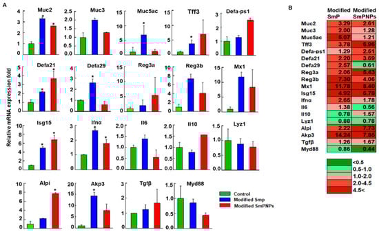 Transcriptional responses of immune related genes in modified SmP and SmPNPs supplemented mice. (A) Relative mRNA expression in control, modified SmP, and modified SmPNPs treatment groups. Relative expression-fold was presented as mean ± standard error. Asterisk mark is used to indicate the significant difference between the pectin treatments and control (3 replicates/group); (B) Comparison of relative expression fold between the treatment groups by color schematic representation. Basal expression level was considered as 1.0-fold; upregulated and down regulated expression were considered as >1.0- and <1.0-folds, respectively.
