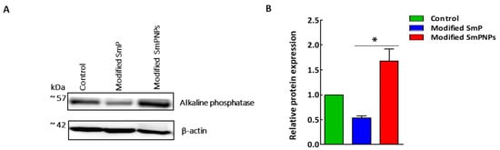 Immunoblot analysis of duodenum intestine alkaline phosphatase expression (IAP) of mice fed with modified SmP and SmPNPs supplemented diet and the control. (A) IAP expression. β-actin was used to confirm equal loading of proteins; (B) Quantitative analyses of IAP expression in modified SmP and SmPNPs, which normalized to β-actin and compared with the control. Data are expressed as the mean ± standard error (n = 3).