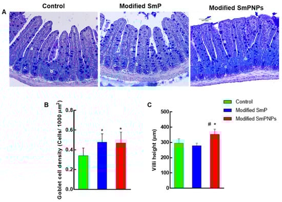 The effect of modified SmP and SmPNPs supplementations to mice was compared with the control group on intestinal morphology and morphometry using the histological analysis of gut (jejunum). Light micrographs of histological sections from all three groups did not show any pathological changes such as necrosis and inflammation (Figure 6A). The alcian blue (AB) and periodic acid-Schiff (PAS) stained sections showed a significant (p < 0.05) increase of goblet cell density (0.5 ± 0.03 cells/1000 µm2) in modified SmP and SmPNPs supplemented mice as compared with the control group (0.3 ± 0.02 cells/1000 µm2) (Figure 6B). Furthermore, villi height in modified SmPNPs (352 ± 10 µm) supplemented group was significantly increased as compared with both the control (295 ± 8 µm) and modified SmP (279 ± 4 µm) groups (Figure 6C).