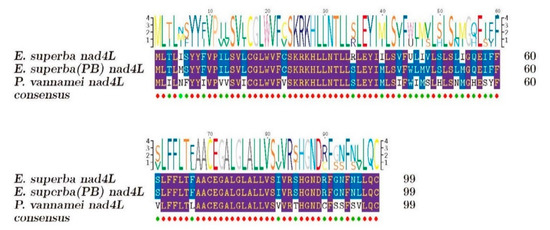 Along with the nad4L sequence extracted from the Antarctic krill mitochondrial genome, we also extracted several other malacostracan nad4L sequences from the NCBI for a subsequent phylogenetic analysis. Examined species include Penaeus chinensis, P. vannamei, P. monodon, E. superba (from the present study), E. superba (PB), and Cherax destructor (as the out group). The translated protein sequences from these species were aligned using mafft v7.158b [65] with default parameters. The phylogenetic tree was constructed with the Neighbor Joining (NJ) of pairwise distances using MEGA 7.0 [23]. Multiple sequence alignment was performed using MEGA 7.0 [23], and the archived results were further analyzed and visualized by TEXshade (version 2.12.14) [66].