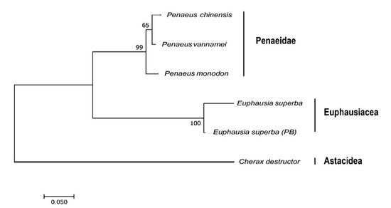 To confirm the Antarctic krill in the present study is the same species as reported E. superba (PB) [6] and to provide more evidence for the phylogenetic relationship between Penaeidae and Euphausiacea, we used the nad4L sequence of Australian freshwater crayfish (Cherax destructor; NCBI Gene ID: 2827710) as an out-group and constructed a phylogenetic tree of nad4L among the Antarctic krill, the whiteleg shrimp, and several other representative shrimps. The established phylogenetic topology was divided into two main groups of Penaeidae and Euphausiacea (Figure 3). The nad4L identified for the Antarctic krill in the present study was not surprised to be much closer to the reported E. superba (PB)’s [6]. That is to say, the nad4L is practicable for the Antarctic krill in species identification and has potential for origin determination.