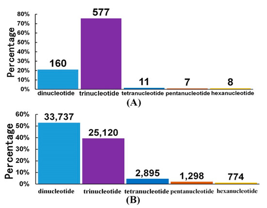 In the transcriptome assembly, the most abundant type of SSRs was the trinucleotide repeats. As shown in Figure 4A, the total number of SSRs with trinucleotide repeats was 577, and their percentage reached 75.62%; the second highest number of SSRs, 160, was with dinucleotide repeats. However, in our partial genome raw data, the situation seemed to be different. The most abundant SSRs were with dinucleotide repeats (33,737), accounting for 52.9%; SSRs with trinucleotide repeats were dropped down to the second highest number, 25,120 (see more details in Figure 4B).