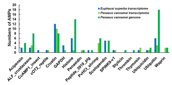 Summary of the identified anti-microbial peptides (AMPs)/AMP precursors from the Antarctic krill transcriptome and the whiteleg shrimp transcriptome and genome assemblies. Blue bars represent those identified in the former (E. superba), and green bars represent those retrieved from the latter (P. vannamei).