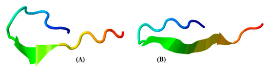 Predicted 3D structures of CcAMP1_insect in insect C. chinensis (A) and the Antarctic krill (B). They were predicted by I–TASSER with high confidence (see more details in Section 3.2).