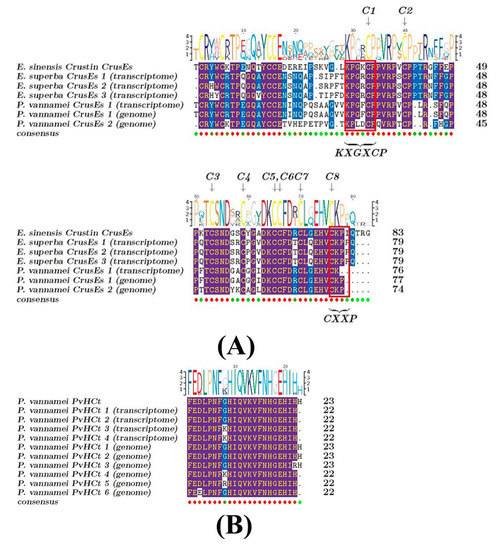 Multiple sequence alignment of representative AMPs/AMP precursors. (A) Crustins from different species. The eight cysteine residues, conserved in all crustaceans with the consensus sequences of whey-acidic proteins [26], were also present in the CrusE sequences, as indicated by arrows and C1~C8. (B) PvHCt from the whiteleg shrimp (P. vannamei). Red circles at the bottom stand for the same residues. Blue marks represent the alignment with identity >50%.
