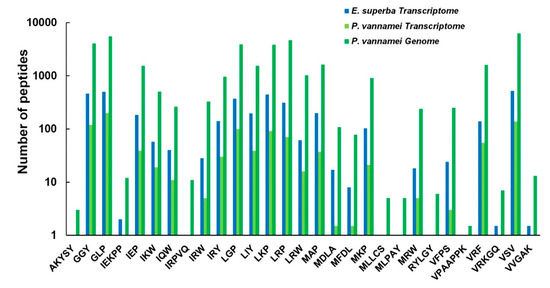 The AHTPs with the top 50 inhibitory activities were compiled as a local searching reference as described in our previous study [13]. Employing a local custom Perl script pipeline, we identified matched AHTPs sequences and locations from target proteins in the transcriptomes of E. superba [1] and P. vannamei [24], as well as the genome of P. vannamei [8]. AHTPs hit numbers in the mapped proteins were summarized for comparison between the two crustacean species.