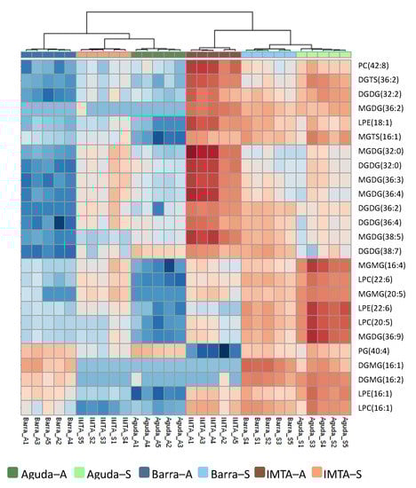 - Rosset, S.; Koster, G.; Brandsma, J.; Hunt, A.N.; Postle, A.D.; D’Angelo, C. Lipidome analysis of Symbiodiniaceae reveals possible mechanisms of heat stress tolerance in reef coral symbionts. Coral Reefs 2019, 38, 1241–1253. [Google Scholar] [CrossRef]