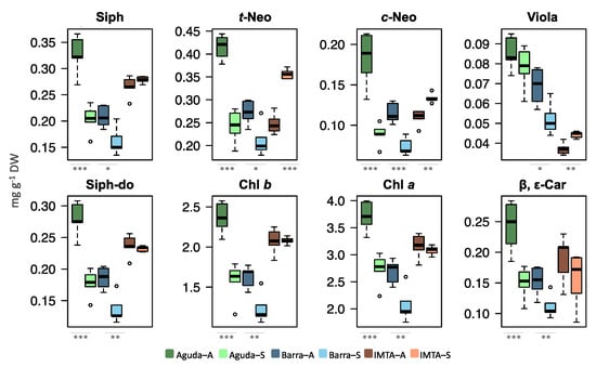 - Schmid, M.; Guihéneuf, F.; Stengel, D.B. Ecological and commercial implications of temporal and spatial variability in the composition of pigments and fatty acids in five Irish macroalgae. Mar. Biol. 2017, 164, 1–18. [Google Scholar] [CrossRef]