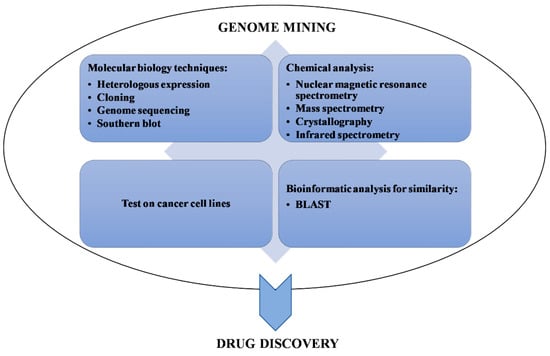 The term “genome mining” are associated to every bioinformatics investigation used to detect not only the biosynthetic pathway of bioactive natural products, but also their possible functional and chemical interactions [15]. Specifically, the genome mining involves the identification of previously uncharacterized natural product biosynthetic gene clusters within the genomes of sequenced organisms, sequence analysis of the enzymes encoded by these gene clusters, together with the experimental identification of the products of the gene clusters (Figure 1; [16]).