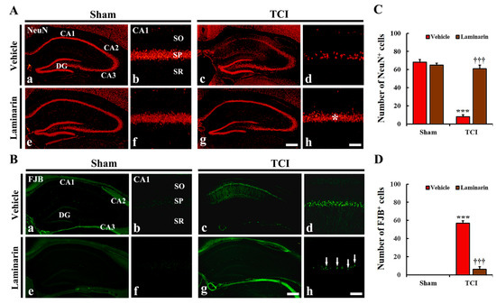 (A,B) Representative images of NeuN immunofluorescence (A) and FJB histofluorescence staining (B) in CA1 of the vehicle-sham (a,b), vehicle-IR (c,d), laminarin-sham (e,f), and laminarin-IR (g,h) groups at five days after IR. Regarding the vehicle-IR group, a few NeuN+ and many FJB+ cells are shown in the stratum pyramidal (SP). However, in the laminarin-IR group, numerous NeuN+ cells (asterisk) and a few FJB+ cells (arrows) are shown in the SP. CA, cornu ammonis; DG, dentate gyrus; FJB, Fluoro-Jade B; NeuN, nuclear antigen; SO, stratum oriens; SR, stratum radiatum. Scale bar = 400 μm (a,c,e,g), 50 μm (b,d,f,h). (C,D) Mean number of NeuN+ (C) and FJB+ cells (D) in CA1. The bars indicate means ± SEM (n = 7/group; *** p < 0.001 versus each sham group, ††† p < 0.001 versus vehicle-IR group).