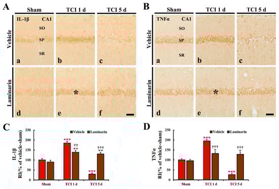 (A,B) Immunochemistry for IL-1β (A) and TNFα (B) in CA1 of the vehicle-sham (a), vehicle-IR (b,c), laminarin-sham (d), and laminarin-IR (e,f) groups at one day (b,e) and five days (c,f) after IR. Regarding the vehicle-IR group, IL-1β and TNFα immunoreactivities are significantly increased in the stratum pyramidale (SP) (asterisks) and hardly shown at five days post-IR. Concerning the laminarin-IR group, IL-1β and TNFα immunoreactivities in the SP (asterisks) are significantly lower than those in the vehicle-IR group at one day post-IR and not changed at five days post-IR. Interleukin, IL; tumor necrosis factor, TNF; SO, stratum oriens; SR, stratum radiatum. Scale bar = 50 μm. (C,D) Relative immunoreactivity (RI) of IL-1β (C) and TNFα (D) immunoreactivity in CA1 pyramidal cells. The bars indicate the means ± SEM (n = 7/group; * p < 0.05, ** p < 0.01, *** p < 0.001 versus each sham group, †† p < 0.01, ††† p < 0.001 versus vehicle-IR group).