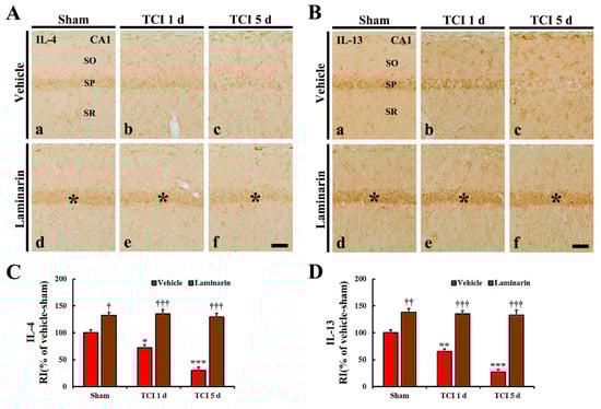 Concerning the laminarin-sham group, IL-4, and IL-13 immunoreactivities in CA1 pyramidal cells were significantly higher (about 132% and 138%, respectively) than that in the vehicle-sham group (Figure 5A(d),B(d),C,D). Regarding the laminarin-IR group, the increased IL-4 and IL-13 immunoreactivities in the CA1 pyramidal cells were maintained at one and five days post-IR (Figure 5A(e,f),B(e,f),C,D).