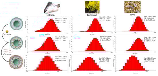 Schematic and physicochemical characterization of salmon, rapeseed and soya nanoliposomes, curcumin-loaded nanoliposomes and curcumin-loaded nanoliposomes coated with chitosan.