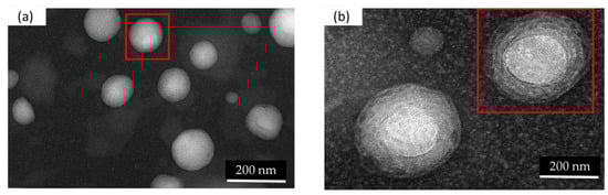 Small unilamellar vesicles (SUV) can be observed in the TEM images of nanoliposomes that were prepared via sonication followed by high-pressure homogenization (Figure 2a). A small quantity (10%) of oil droplets in each formulation, in the form of nanoemulsions, can be observed. Figure 2b shows a chitosan contrasting band surrounding the nanoliposomes. The TEM images confirm the size results measured via the dynamic light scattering (DLS) technique.