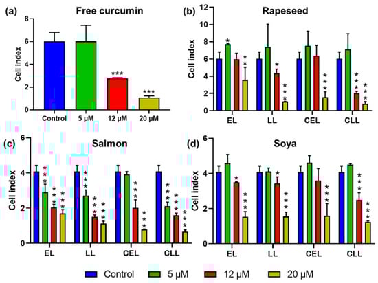 MCF-7 cell index kinetics exposed to (a) free curcumin, (b) rapeseed, (c) salmon and (d) soya, empty liposomes (EL), curcumin-loaded liposomes (LL), chitosan-coated empty liposomes (CEL) and chitosan-coated curcumin-loaded liposomes (CLL). Cell index values were recorded after 96 h of liposome exposure. The reported data are the means of six replicates. Parametric data were analyzed using a one-way (a) and two-way (b–d) ANOVA followed by Dunnett’s test. Significance was indicated as * (p < 0.05), ** (p < 0.01) and *** (p < 0.001).
