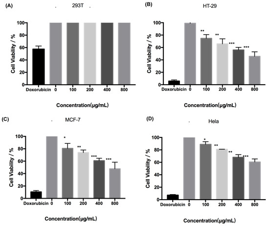 Cytotoxicity of fucoidan. (A) Toxicity of fucoidan to 293T cell is expressed as the means ± SD (n = 3). (B) Toxicity of fucoidan to HT-29 cells is expressed as the means ± SD (n = 3). (C) Toxicity of fucoidan to MCF-7 cell is expressed as the means ± SD (n = 3). (D) Toxicity of fucoidan to HeLa cell is expressed as the means ± SD (n = 3). *, p < 0.05; **, p < 0.01; ***, p < 0.001.