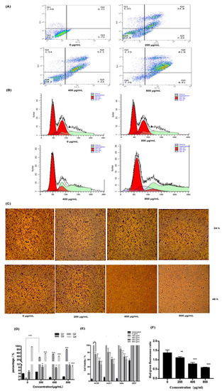 Cells in log-phase growth were seeded in six-well plates at a density of 1 × 105 cells/well. After 24 h, 0, 200, 400, and 800 μg/mL of fucoidan was added and the cultures were incubated for 48 h. The cells were then harvested, washed, and resuspended in the binding buffer containing Annexin V and propidium iodide (PI). After incubation for 15 min at room temperature, the stained cells were analyzed by flow cytometry. Data were analyzed using FlowJo software (10.0.7., BD, Franklin, NJ, USA).