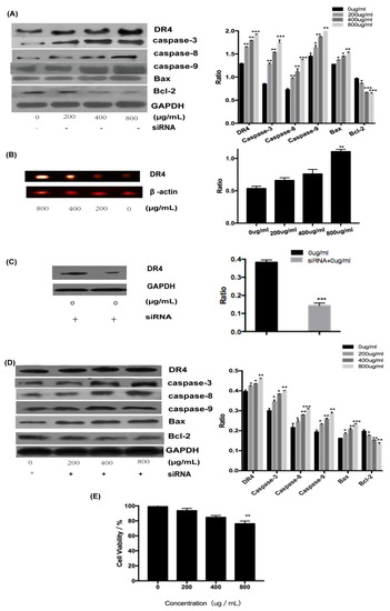 To explore the involvement of receptors in the activation of apoptosis by fucoidan, the expression of DR4 and related proteins at the transcriptional and translational level was determined. All examined proteins, including DR4 and caspase-3, -6, and -9, were upregulated by fucoidan in a concentration-dependent manner (Figure 4A). The expression level of DR4 increased with the increase of fucoidan concentration at the gene level and the result demonstrated that DR4 was required for the induction of apoptosis by fucoidan (Figure 4B). To determine whether DR4 was required for the induction of apoptosis by fucoidan, siRNA was used to silence its expression, whose silence rate was about 65% (Figure 4C). However, although the expression of all examined proteins was suppressed in the presence of siRNA targeting DR4 (Figure 4D), these proteins did not decrease significantly with the increasing concentration in comparison, which may be because of DR4’s low silence rate. However, DR4 silencing decreased the cytotoxicity of fucoidan (800 μg/mL) on HT-29 cells, resulting in an increase in the survival rate from 40% to 75% (Figure 4E). These results demonstrated that fucoidan can induce apoptosis of HT-29 cells by upregulating DR4.
