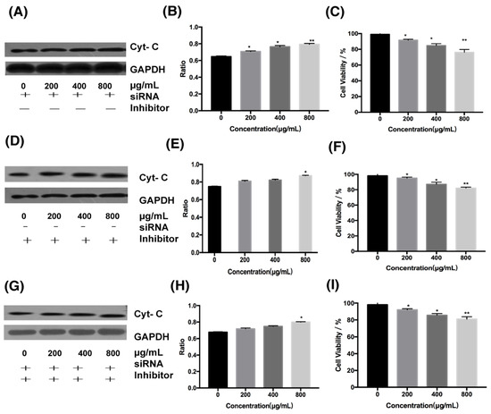 Cells in this experiment were divided into three groups: the first group, cells treated with siRNA for DR4; the second group, cells treated with cytochrome C inhibitor; and the third group, cells treated simultaneously with cytochrome C inhibitor and DR4 siRNA. We can find that in cells treated only with DR4 siRNA at 800 μg/mL, the ratio of cytochrome C expression in the experimental group to the control group decreased from 1.56 to 1.32 (Figure 5C and Figure 6A,B), and the cell survival rate was increased from 40% to about 75%( Figure 2B and Figure 6C). When cells were treated only with the inhibitor of cytochrome C or treated simultaneously with cytochrome C inhibitor and DR4 siRNA, there was no significant difference in the ratio and cell survival rate between the second and third group. In the second and third group, it can be seen that the ratio decreased from 1.56 to 1.15 and 1.13 at 800 μg/mL, respectively (Figure 5C and Figure 6D–H), both lower than the ratio after inhibiting the death receptor pathway; besides, at 800 μg/mL, the cell survival rate was increased from 40% to about 80% ( Figure 2B and Figure 6F,I), both higher than 75%.Therefore, the difference of cell survival rate and cytochrome C expression indicated that the mitochondrial pathway was downstream of the DR4 pathway.